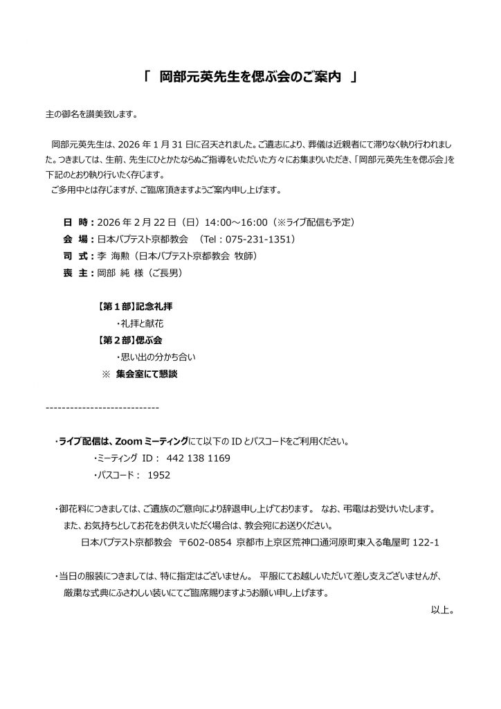 岡部元英先生は、2026年1月31日に召天されました。ご遺志により、葬儀は近親者にて滞りなく執り行われまし た。つきましては、生前、先生にひとかたならぬご指導をいただいた方々にお集まりいただき、「岡部元英先生を偲ぶ会」を下記のとおり執り行いたく存じます。